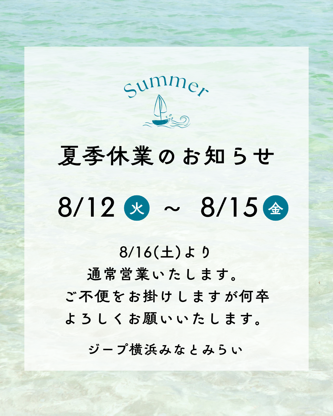 【ジープ横浜みなとみらい】夏季休業日のお知らせ