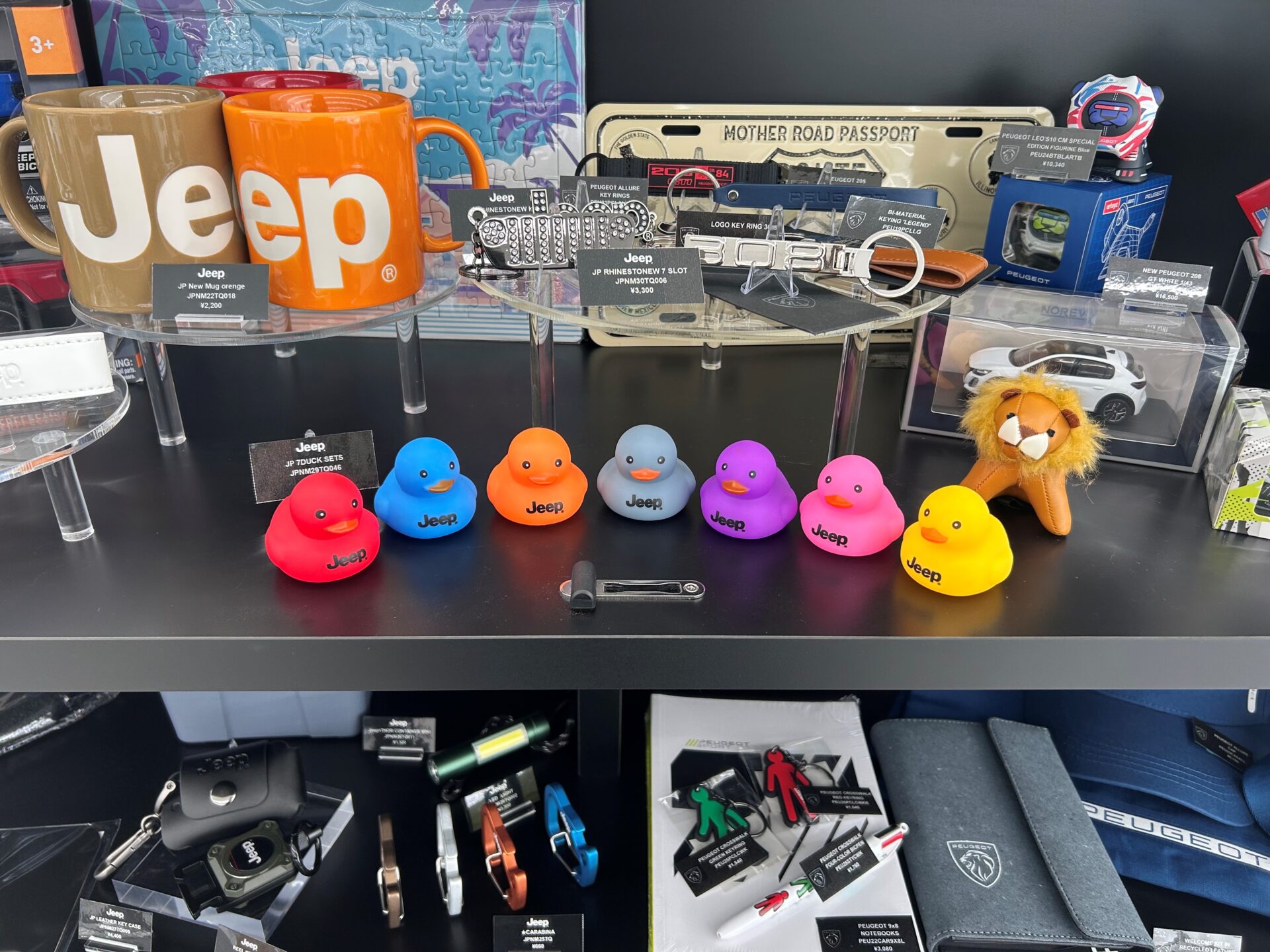 ショーケースではジープ・プジョーのたくさんのグッズがご覧いただけます!!