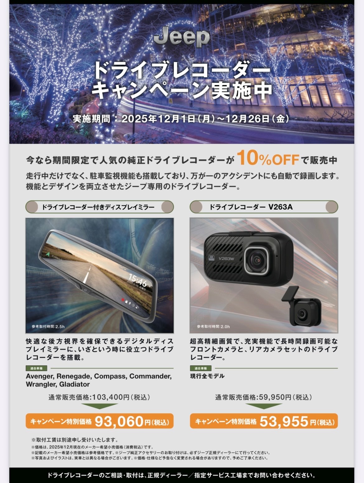 全国のジープ正規ディーラーにて、2025年12月1日(月)〜12月26日(金) の期間限定で、人気のドライブレコーダーが